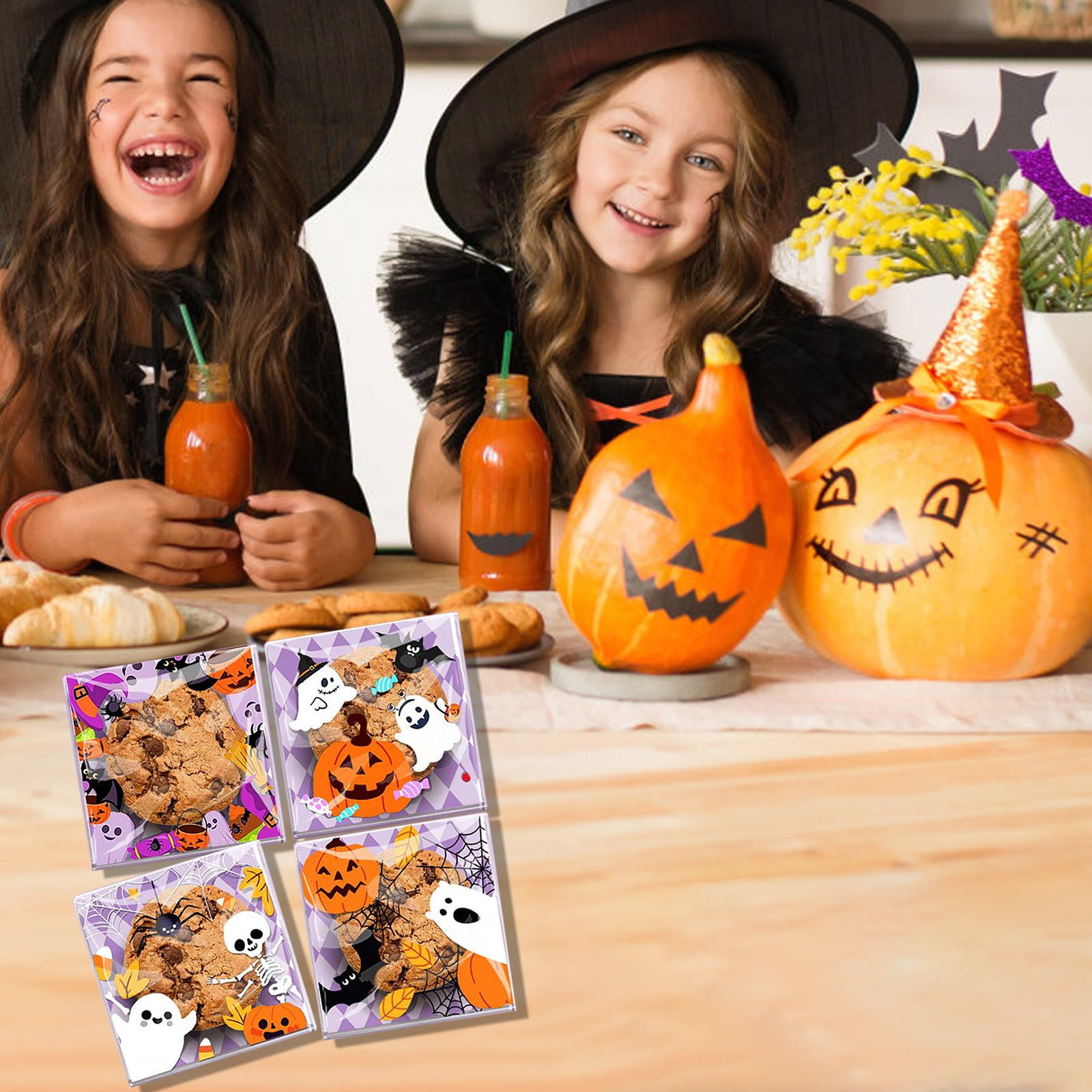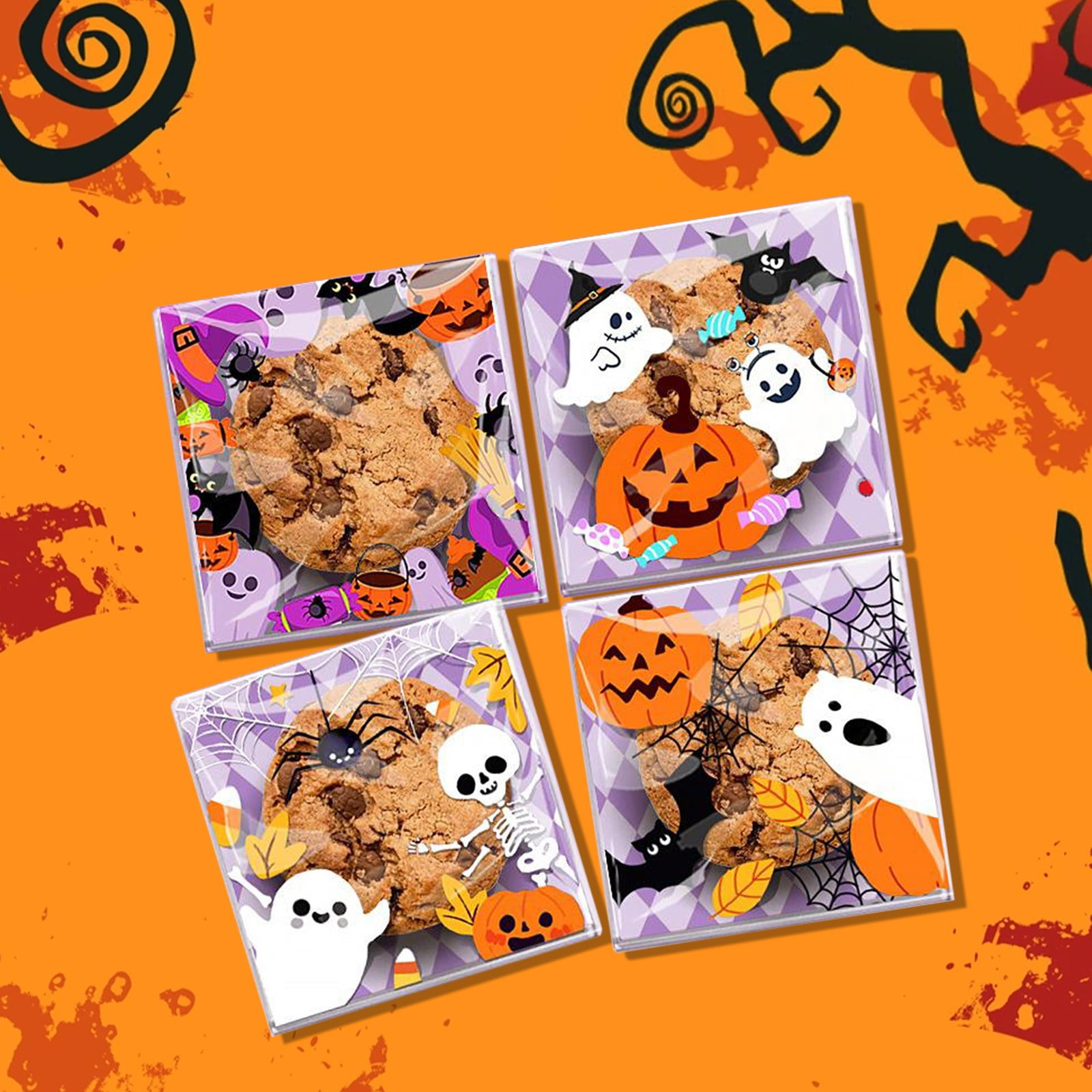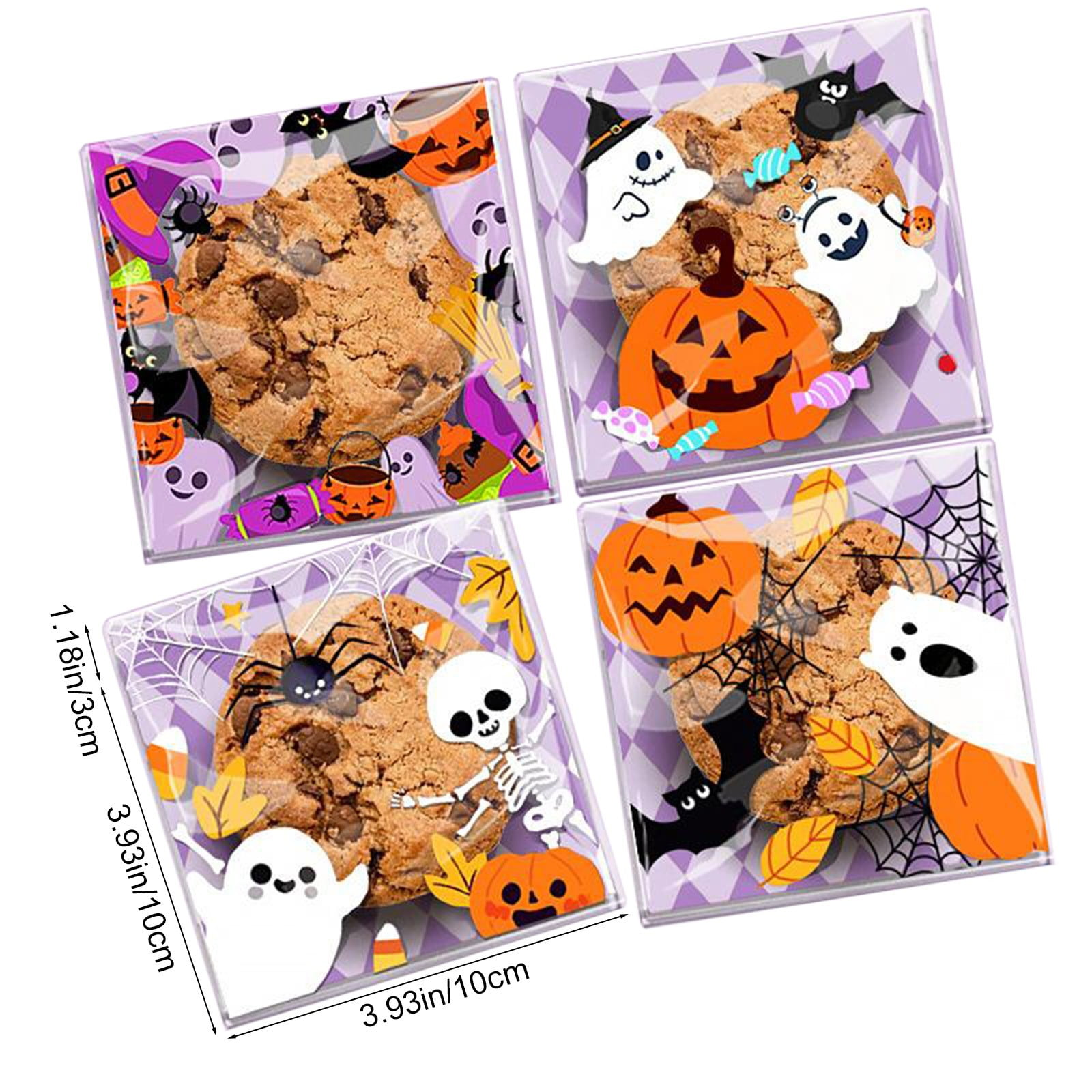 Halloween treat bags; self-sealing candy bags; ghost packaging bags; pumpkin party favors; cookie storage bags; freshness-locking pouches; bulk snack bags; Halloween gift packaging; adhesive treat pouches; nougat storage; party favor supplies; budget packaging