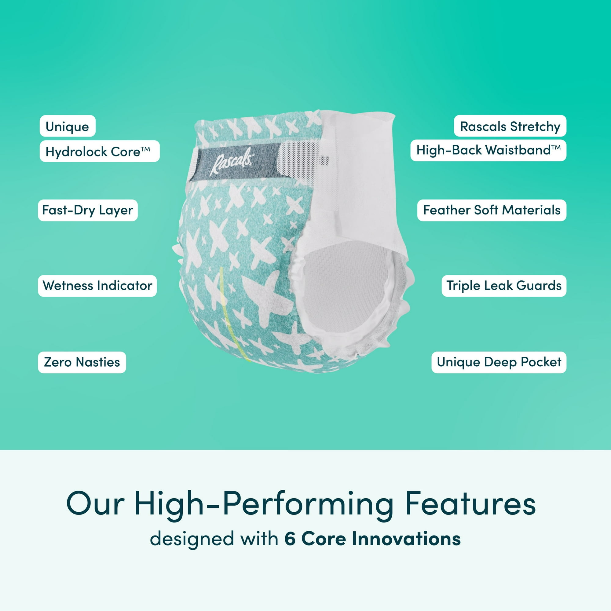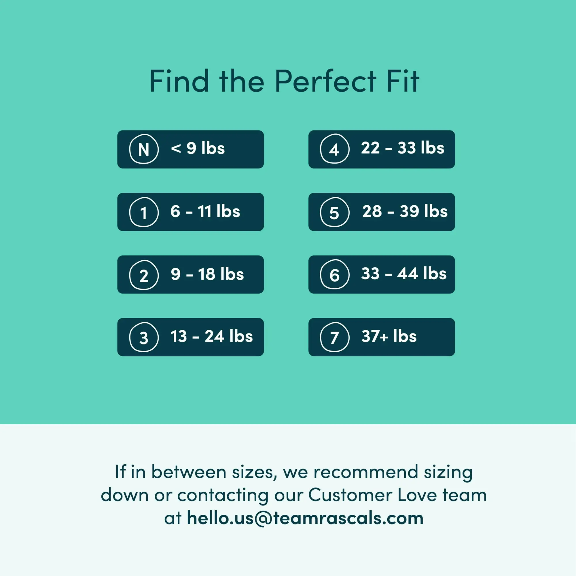 Rascals Premium Diapers are ready for every mess! Designed with 6 Core Innovations for high-performance, our unisex diapers are ultra-absorbent with up to 12 hours of leak protection, making them ideal for both daytime and overnight. Dermatologist-tested and hypoallergenic, Rascals baby diapers are dry and gentle, and safe for newborn, infant and toddler skin. Whether you’re preparing for a baby shower, birth, or pregnancy, Rascals Premium Diapers are a newborn essential and must-have for every parent. Rascals diapers are suitable for babies from 0-37+Ibs and available in size newborn, size 1, size 2, size 3, size 4, size 5, size 6, size 7. Perfect for nighttime, our size range ensures the perfect fit for every stage of your little one’s growth. Our Unique Hydrolock Coreâ„¢ absorbs liquid with 4 layers of protection to help keep leaks contained, and our Stretchy High-Back Waistbandâ„¢ offers a snug comfortable fit. Designed with AirSpunâ„¢ Technology for a breathable and feather-soft feel on skin, our baby diapers are made with Zero Nasties for safe and gentle protection. Don’t just take our word for it, Rascals products are loved by millions of parents worldwide, with over 210,000+ 5-star reviews.* Try Rascals Premium Diapers! Ready for every mess. *Based on all reviews of Rascals diapers, training pants, and wipes across websites globally, including incentivized and organic reviews.
