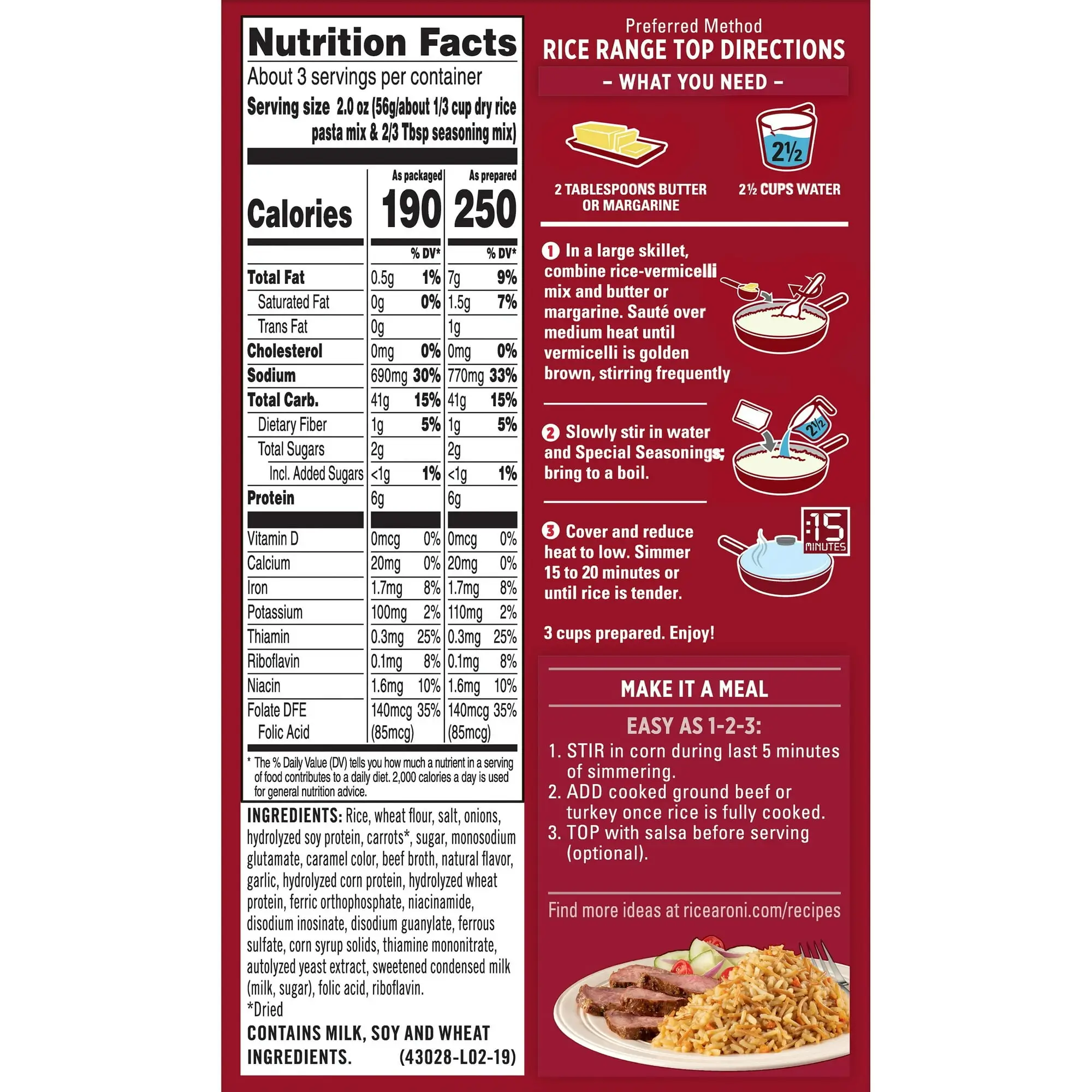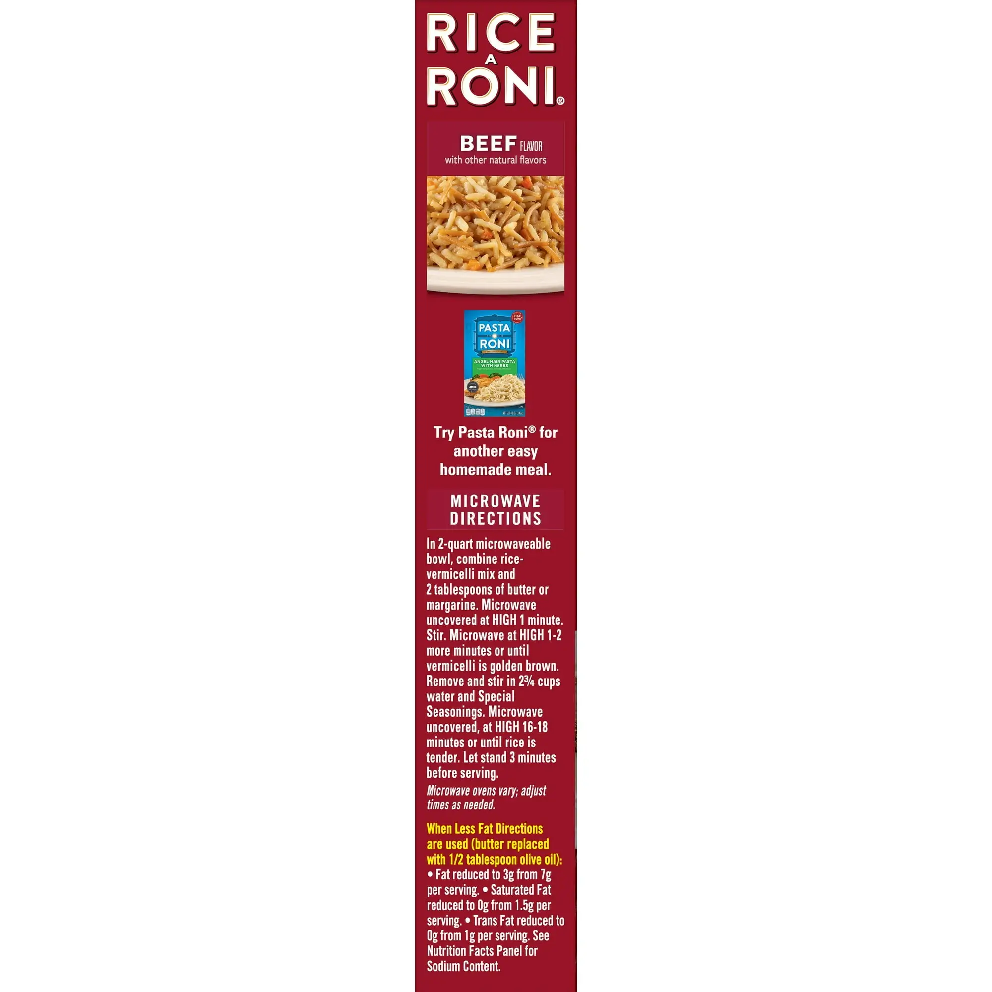 Rice Range Top: What You Need: 2 tablespoons margarine or butter; 2-1/2 cups water. 1. In a large skillet, combine vermicelli mix and margarine or butter. Saute over medium heat until vermicelli is golden brown, stirring frequently. 2. Slowly stir in water and special seasonings; bring to a boil. 3. Cover and reduce heat to low. Simmer 15 to 20 minutes or until rice is tender. 3 cups prepared. Microwave: In 2-quart microwaveable bowl, combine rice-vermicelli mix and 2 tablespoons of margarine or butter. Microwave uncovered at high 1 minute. Stir. Microwave at high 1-2 more minutes or until vermicelli is golden brown. Remove and stir in 2-3/4 cups water and special seasonings. Microwave uncovered, at high 16-18 minutes or until rice is tender. Let stand 3 minutes before serving. Microwave ovens vary; adjust times as needed. Less Fat: Follow Range Top or Microwave directions, except substitute margarine with 1/2 tablespoon olive oil. Fat reduced to 3 g from 9 g per serving, with saturated fat reduced to 0.5 g from 2 g and trans fat reduced to 0 g from 1.5 g per serving. 25 calories from fat per serving.